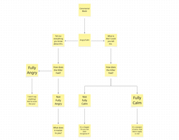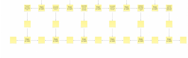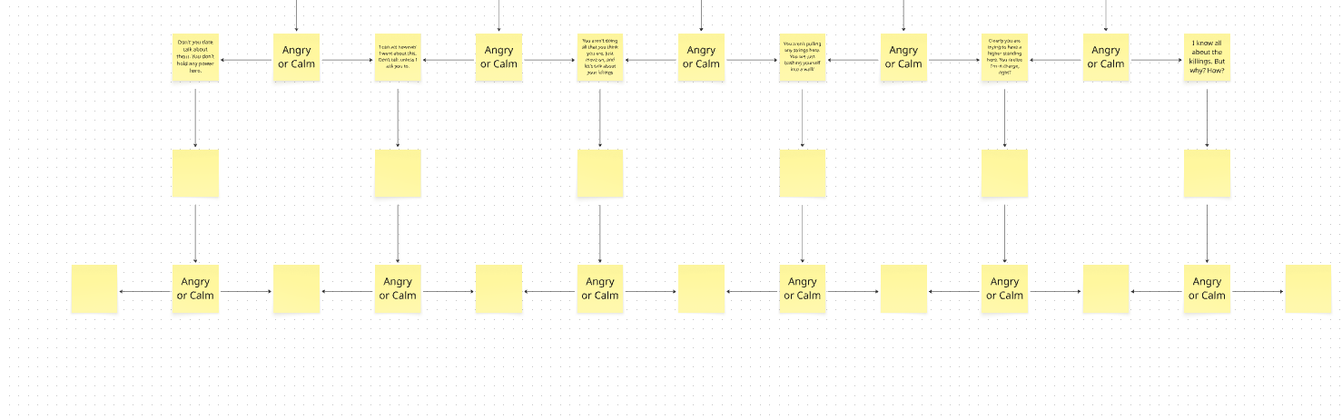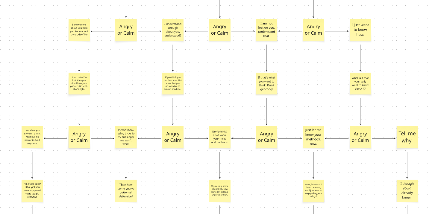 Towards the beginning of the project, when we were still flip flopping ideas, I had high hopes for what I could achieve, and even took the bold task of trying to complete everything on my own. However quickly when we began to get into the actual project, I realized how much I was trying to bite off. The dialogue could be simple at times, but I had a lot of trouble trying to not sound redundant during the interviews. I was able to get a small system in place, however when I was trying to be more unique, I realized how difficult it was to fully plan out what I needed.